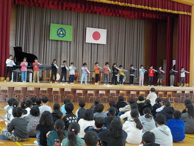 開会行事のあとに、ミニコンサートを行いました。1年生は、鍵盤ハーモニカとトーンチャイムを使っての演奏、2年生は、自分たちで考えた太鼓のリズムを、そして、3年生は聖者の行進の合奏をそれぞれ披露しました。その後、下学年のみんなで元気いっぱいの歌声を体育館に響かせました。上学年の久賀っ子たちは、町の音楽会で披露した合唱と合奏の演奏をしました。今回も、心を一つに息の合ったすてきな演奏となりました。