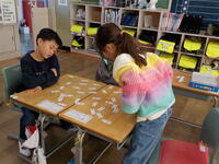 多古高校生が来校し、2回目の花交流を行いました。今回は、サイネリアの芽をポットに移します。前回、蒔いたサイネリアの種がたくさん芽を出している中で、元気に育っている芽を選んでポットに移植しました。ポットへの土の入れ方や芽の移し方を高校生から丁寧に教えてもらい、久賀っ子たちは上手に作業を進めていました。
