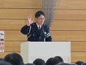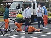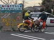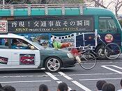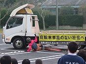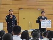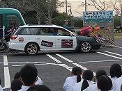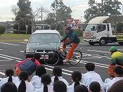 はじめに、町民体育館でリーフレット「ちばサイクルール」を使って香取警察署の警察官から自転車に乗る前と乗るときのルールについて説明がありました。その後、駐車場でプロのスタントチーム「スーパードライバーズ」のみなさんによる、様々な交通事故の再現を見学しました。自動車と自転車の事故が生徒たちの目の前で起こり、交通事故の怖さが伝わってきました。事故は一瞬です。被害者にも加害者にもならないよう、改めて交通安全を心掛けましょう。