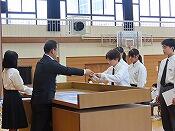 前期終業式を迎えました。式の前に、先日実施した生徒会本部役員選挙で当選した5名の新役員に認証書を授与しました。全員やる気に満ちあふれています。前税と会長からの励ましの言葉を受け、これから活躍してくれると期待しています。前役員のみなさん、1年間ありがとうございました。